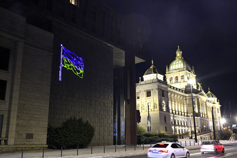 Aktivisté ze skupiny Kaputin a iniciativy Občanský rozcestník dnes večer promítli na Novou budovu Národního muzea v Praze z Washingtonské ulice ukrajinskou vlajku jako připomínku plnohodnotné ruské invaze na Ukrajinu, od které v úterý uběhnou čtyři roky. Laserovou projekci vlajky střídali s projekcí nápisů „Rusko musíme porazit“, potažmo anglickým „We must defeat Russia“.